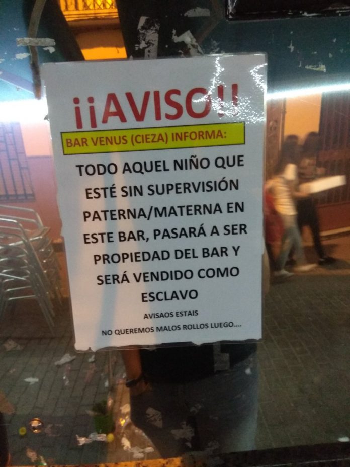 El bar Venus de Murcia ha conquistado a cientos de personas en Twitter por el curioso cartel que exhibe en su local y que supone una advertencia para todo aquel que entre con niños.