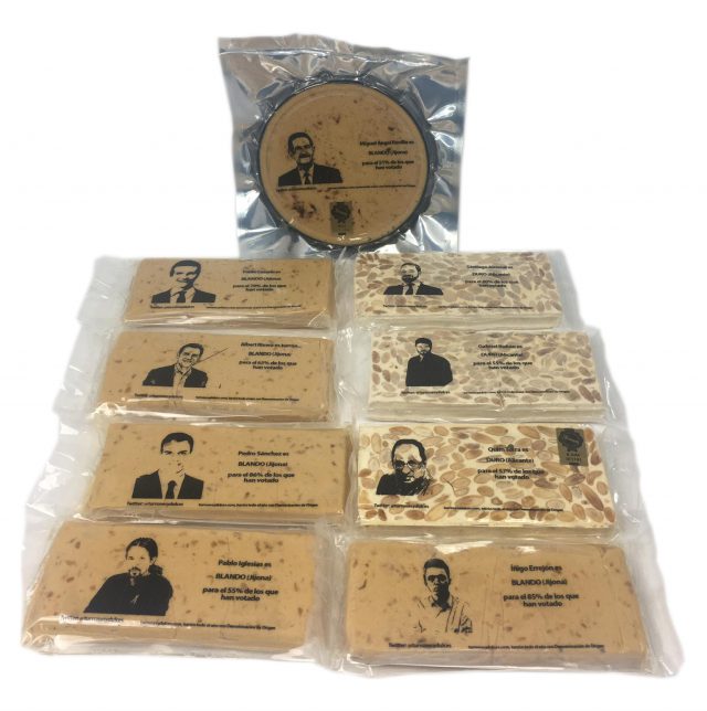 La empresa turronesydulces.com ha tenido la iniciativa de preguntar a sus clientes con qué clase de turrón identifican a los políticos españoles, y este ha sido el resultado: los líderes del PP (Pablo Casado), PSOE (Pedro Sánchez), Ciudadanos (Albert Rivera), Más País (Íñigo Errejón) y Podemos (Pablo Iglesias) fueron catalogados como “blandos”, mientras que el de Vox (Santiago Abascal) recibió la denominación “duro”, al igual que el portavoz de ERC en el Congreso (Gabriel Rufián) y el presidente de la Generalitat (Quim Torra).