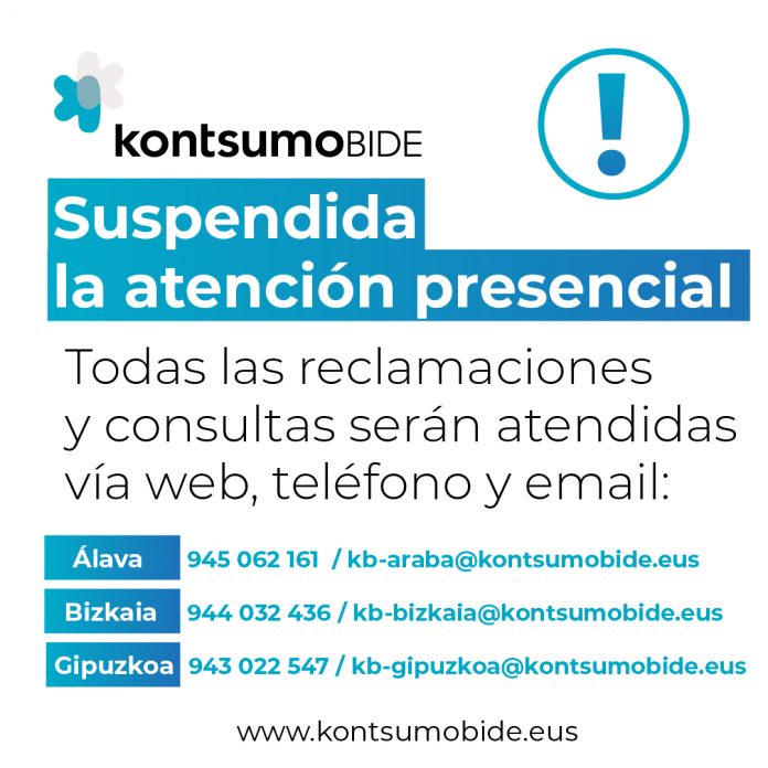 1. Aurrez aurreko arreta eten egin da, eta erreklamazio eta kontsulta guztiak webgune honen bidez erantzungo dira: www.kontsumobide.eus Telefonoz edo posta elektronikoz ere erantzungo dira.