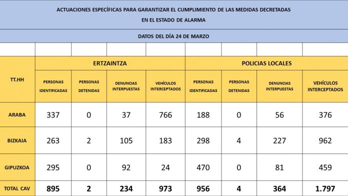 Ertzaintzaren eta udaltzaingoen artean atzo, asteartea, martxoak 24, beste 598 akta edo isun abiarazi zituzten koronabirusaren ondorioz dekretatu den alarma-egoera dela-eta ezarritako neurriak bete ez izanaren ondorioz EAEko Herritarren Segurtasunerako Legea urratzeagatik. Ertzaintzak 234 pertsona zigortu zituen atzo, eta udaltzaingoek, berriz, 364. Bestalde, 6 pertsona atxilotu zituzten arrazoi beragatik.
