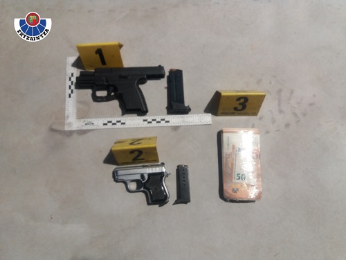 Asimismo, dentro del recinto del caserío había un pabellón, en cuyo interior se localizaron numerosos vehículos. Tras obtener la debida autorización judicial los agentes realizaron una inspección y se pudo comprobar que varios de los vehículos tenían los números de bastidores falsificados. Asimismo, en el arcón trasero de una motocicleta allí estacionada  fueron encontradas dos armas de fuego con sus respectivas municiones y un fajo de billetes embalado en plástico transparente por valor aproximado de diez mil euros que fueron ocupados por su dudosa procedencia.