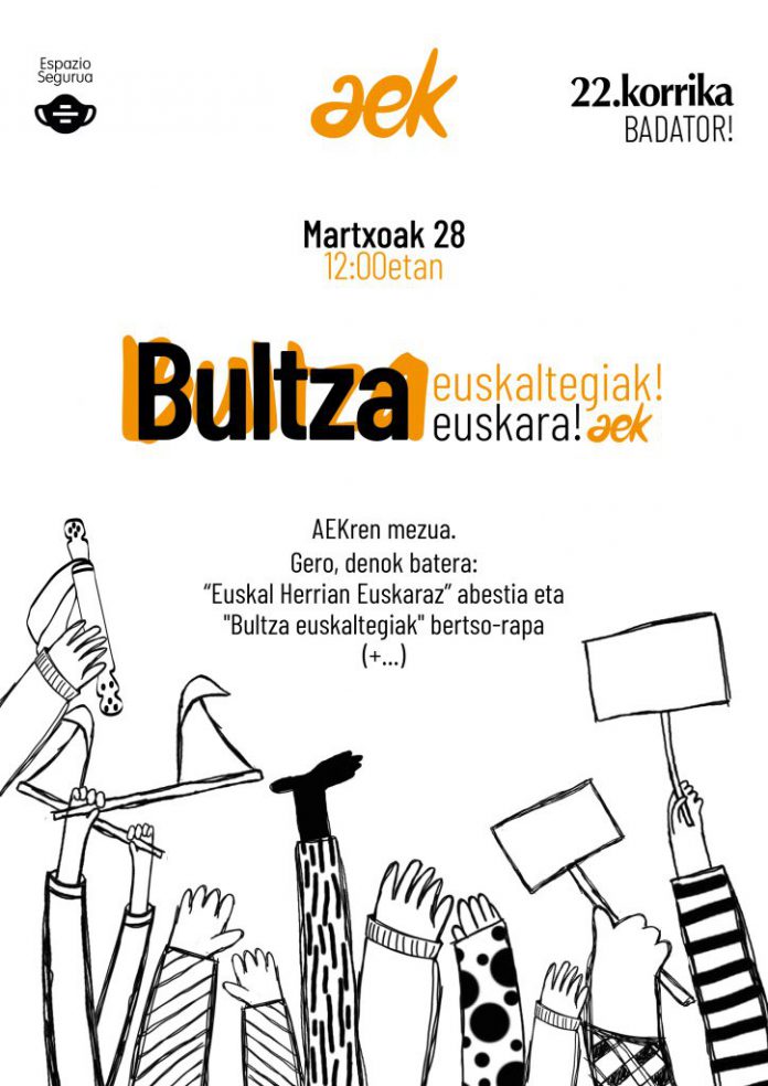 Euskal Herriko herrialde guztietan izango dira, eguerdiko 12etan, ekitaldi xumeak, ordu erdikoak, unean uneko osasun-neurrietara zeharo egokituak. Bultza euskaltegiak!-Bultza euskara! izeneko dinamikaren barruan antolatu diren ekitaldiak dira, aurten ere euskalduntze-mugimenduaren garrantzia plazaratzeko. AEKren mezua irakurtzeaz gain, giroa berotzeko, bi abesti entzungo dira herri guztietan. Batetik, “Euskal Herrian Euskaraz” abesti ezaguna, eta, bestetik, berariaz egun horretarako […]