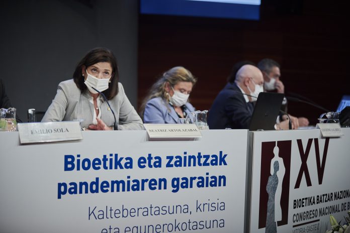 Beatriz Artolazabal ha comenzado su intervención mostrando su agradecimiento “a la Asociación de Bioética Fundamental y Clínica, y a los Comités de Ética de Euskadi por organizar este congreso en Gasteiz”. La consejera de Igualdad, Justicia y Políticas Sociales ha valorado “sinceramente el esfuerzo por organizarlo aquí y también el acierto al elegir ‘Bioética y cuidados en tiempos de Pandemia’ como tema”, antes de añadir que “en este Congreso se tratan las grandes cuestiones sobre las que debemos de reflexionar en este momento”.