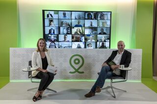 Lehenengo irudian Garazi Ayesta eta Igor Calzada, topaketa digitala gidatu zutenak, eta online parte-hartzaileak atzean, pantailan. Bigarrenean, topaketaren aurkezleak Gorka Álvarez Aranburu, Kanpoan den Euskal Komunitatearentzako zuzendaria, erdian haien alboan dagoela.
