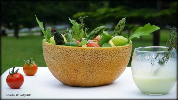- Dentro de las cáscaras de melón, introducimos primero las bolitas de melón, con la menta picada, los espárragos trigueros, los tomates cherry, el aguacate y los berberechos.
