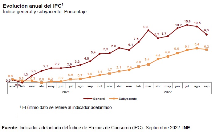 El Índice de Precios de Consumo (IPC) ha descendido seis décimas en septiembre en comparación al mes de agosto y ha recortado su tasa interanual 1,5 puntos, situándose en el 9% según los datos avanzados publicados hoy por el Instituto Nacional de Estadística (INE). Este último dato es 1,8 puntos inferior al pico alcanzado el pasado mes de julio, cuando el IPC se situó en el 10,8 %, su nivel más alto desde septiembre de 1984.