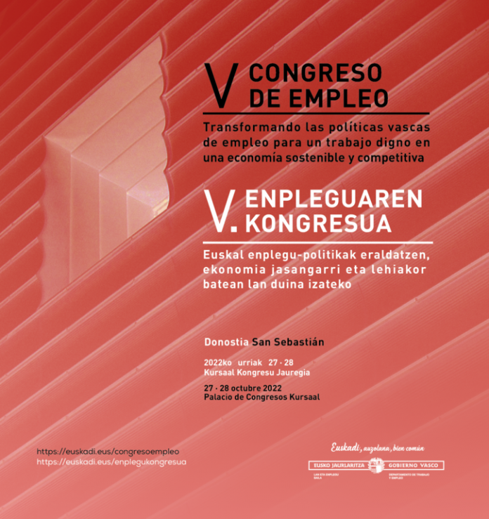 Urriaren 27an eta 28an, Enpleguaren V. Euskal Kongresua egingo da Donostiako Kursaal Kongresu Jauregian. Bertan, enplegua gaur egungo testuinguruan nola eraldatzen ari den aztertuko da, bai eta administrazioak ekonomia lehiakor batean duina izan dadin ematen ari diren erantzunak ere. Idoia Mendia Lehendakariordeak inauguratuko du, eta bertan izango dira, besteak beste, Cristina Garmendia Berrikuntzarako COTEC Fundazioko presidente eta Zientzia eta Berrikuntzako ministro ohia, Ruth Finkelstein Zahartze Osasungarrirako Brookdale Zentroko zuzendari exekutibo eta New Yorkeko Hunter Collegeko Hiri Osasun Publikoko irakaslea eta Gerardo Gutierrez Estatuko Enplegu Zerbitzu Publikoko (SEPE) zuzendari nagusia.
