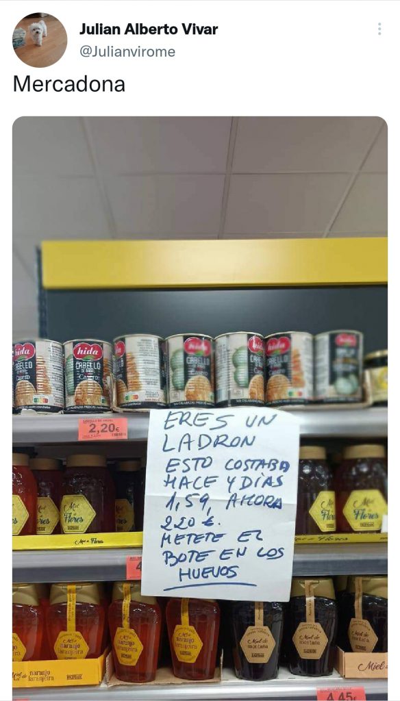Euskadi Así critica un cliente la subida de precios en el supermercado Por agenciadenoticias.es - 5 diciembre, 2022 0 Un cliente se manifiesta contra la subida de precios colgando este mensaje en un estante del supermercado.