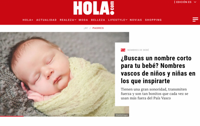 El portal de la revista ‘Hola’ ha publicado un artículo titulado: «¿Buscas un nombre corto para tu bebé? Nombres vascos de niños y niñas en los que inspirarte». Así se dirige a las personas que buscan un nombre para su niño o niña recomendando una lista de nombres en euskera, «la mayoría de los cuales son cortos, sonoros y repletos de fuerza». Según el texto, escoger un nombre vasco es «una apuesta por la originalidad».