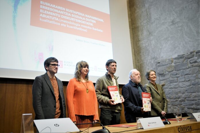 Nafarroako biztanle gehienak (% 63) «euskara sustatzearen aldekoak edo oso aldekoak» dira, eta % 17 baino ez daude aurka, Xabier Erizek eta Carlos Vilchesek Eusko Ikaskuntzaren eta Nafarroako Gobernuko Memoria eta Bizikidetzako, Kanpo Ekintzako eta Euskarako departamentuaren arteko hitzarmenaren esparruan egindako ikerketa baten arabera. Hori da Foru Komunitateko errealitate soziolinguistikoa eta euskararen sustapenaren inguruan herritarren artean oihartzun handiena duten balioak hobeto ezagutzera bideratutako ikerketaren ondorio nagusia. Ana Urkiza Eusko Ikaskuntzako lehendakaria, Ana Ollo Nafarroako Gobernuko lehendakariorde eta Memoria eta Bizikidetzako, Kanpo Ekintzako eta Euskarako kontseilaria, Xabier Erize eta Carlos Vilches ikerlari eta zuzendari zientifikoak eta Javier Arakama Euskarabidea-Euskararen Nafar Institutuko zuzendari gerentea izan dira aurkezpenean, astearte honetan Iruñeko Kondestablearen Jauregian izan dena.