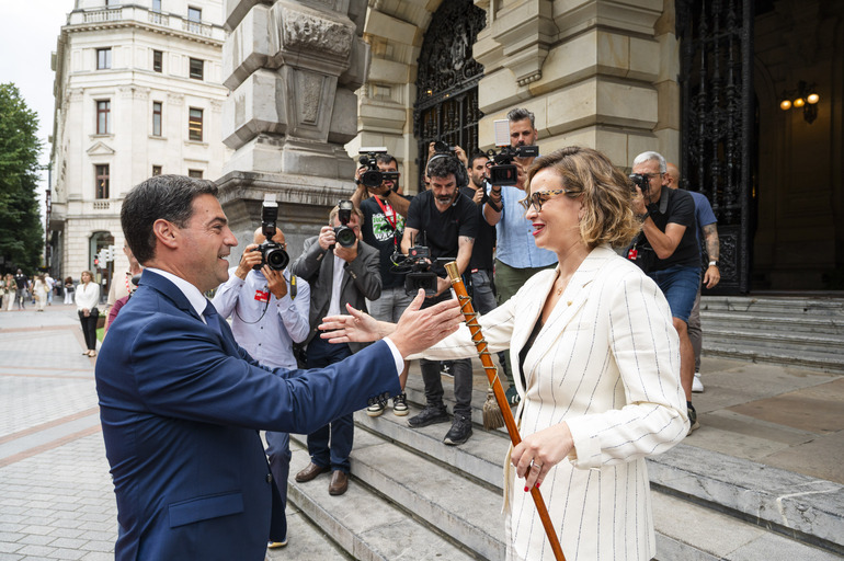 Imanol Pradales Lehendakari, Begoña Pedrosa, Hezkuntzako sailburua, Alberto Martínez, Osasuneko sailburua eta Juan Ignacio Pérez Iglesias, Zientzia, Unibertsitate eta Berrikuntzako sailburuarekin batera, Bizkaiko Foru Jauregian izandako San Ignacioko harreran izan da.
