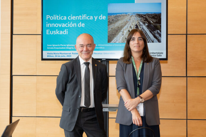 Eusko Jaurlaritzako Zientzia, Unibertsitate eta Berrikuntza sailburu Juan Ignacio Pérez Iglesias Kataluniako Generalitateko Ikerketa eta Unibertsitate sailburu Núria Montserratekin Pulido bildu da Bilbon egindako erakunde arteko bilera batean.