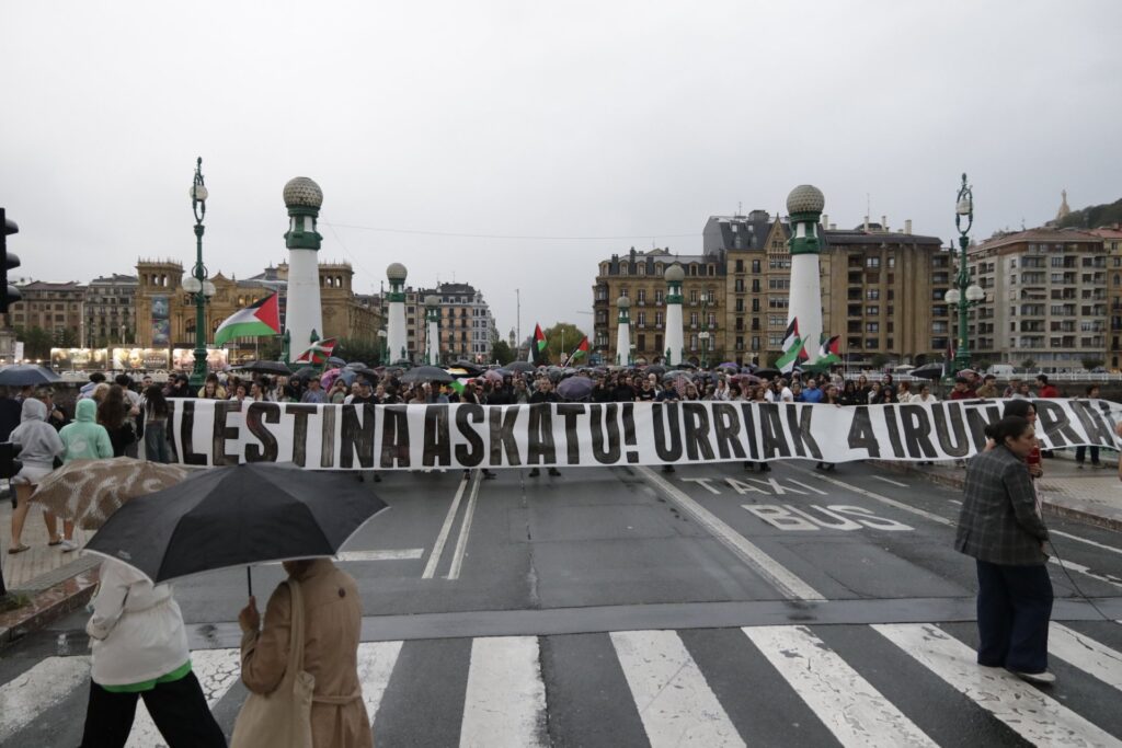 Alrededor de 3.000 personas bloquearon ayer por la tarde el puente de Zurriola, en Donostia, en el marco de una protesta en apoyo a Gaza. La concentración comenzó hacia las 19:30 horas, dentro de la campaña internacional convocada por el movimiento DisruptComplicity, según informó un portavoz de la plataforma Palestinarekin Elkartasuna, que respaldó la movilización.