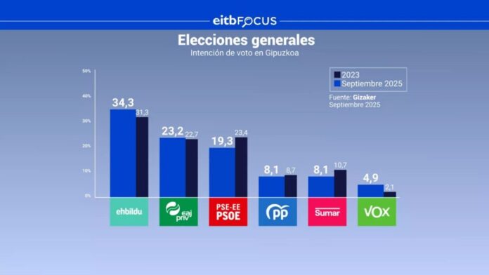 Si hoy se celebrasen elecciones generales, EH Bildu reforzaría su posición en Gipuzkoa y se consolidaría como la fuerza más votada. Así lo refleja la última encuesta de EITB Focus, que otorga a la coalición soberanista un 34,3 % de apoyo, tres puntos más que en los comicios de 2023. Ese avance se traduciría en un escaño adicional, pasando de dos a tres diputados en el Congreso.