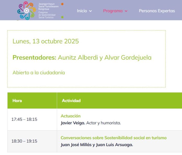 - 18:30 – 19:15: Turismo-arloan Jasangarritasun Sozialari buruzko elkarrizketak, Juan José Millás idazle eta kazetariarekin eta Juan Luis Arsuaga Dibulgazioko eta hausnarketa sozialeko bi erreferente dira, eta bidaiatzeko eta modu kontziente eta arduratsuagoan bizitzeko moduari buruz hitz egingo dute.