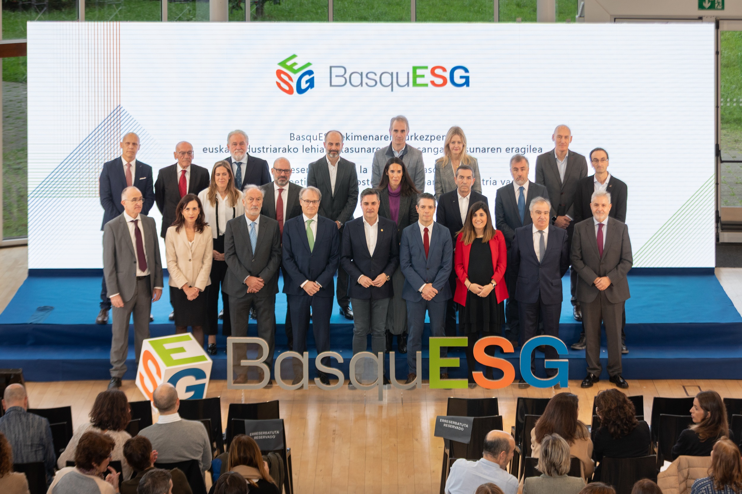 Eusko Jaurlaritzak BasquESG ekimena aurkeztu du gaur. Onartu berri den Euskadiko 2030 Industria Planean jasotako proiektu eraldatzaileetako bat da BasquESG, eta euskal ETEen errealitatera egokitutako jasangarritasunaren txosten- eta ebaluazio-sistema propioa sortzea du helburu. Eusko Jaurlaritzako Industria, Trantsizio Energetiko eta Jasangarritasuneko sailburu Mikel Jauregirekin batera, euskal enpresa traktore eta finantza-entitate handietako arduradun nagusiak izan dira aurkezpen-ekitaldian, Estatuan aitzindaria den ekimen honetan ahaleginak batu dituztenak: Kutxabank, Laboral Kutxa, Iberdrola, Petronor, ITP Aero, Ingeteam, CAF, Mercedes Benz eta Sidenor.