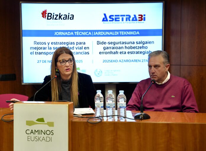 Estibaliz Olabarri Trafikoko zuzendariak «Bide-segurtasuna salgaien garraioan hobetzeko erronkak eta estrategiak» jardunaldian parte hartu du gaur goizean. Bizkaiko Garraio Enpresarien Elkarteak (ASETRABI) antolatu du, Bizkaiko Foru Aldundiarekin eta Euskadiko Bide, Ubide eta Portuetako Ingeniarien Elkargoarekin lankidetzan.