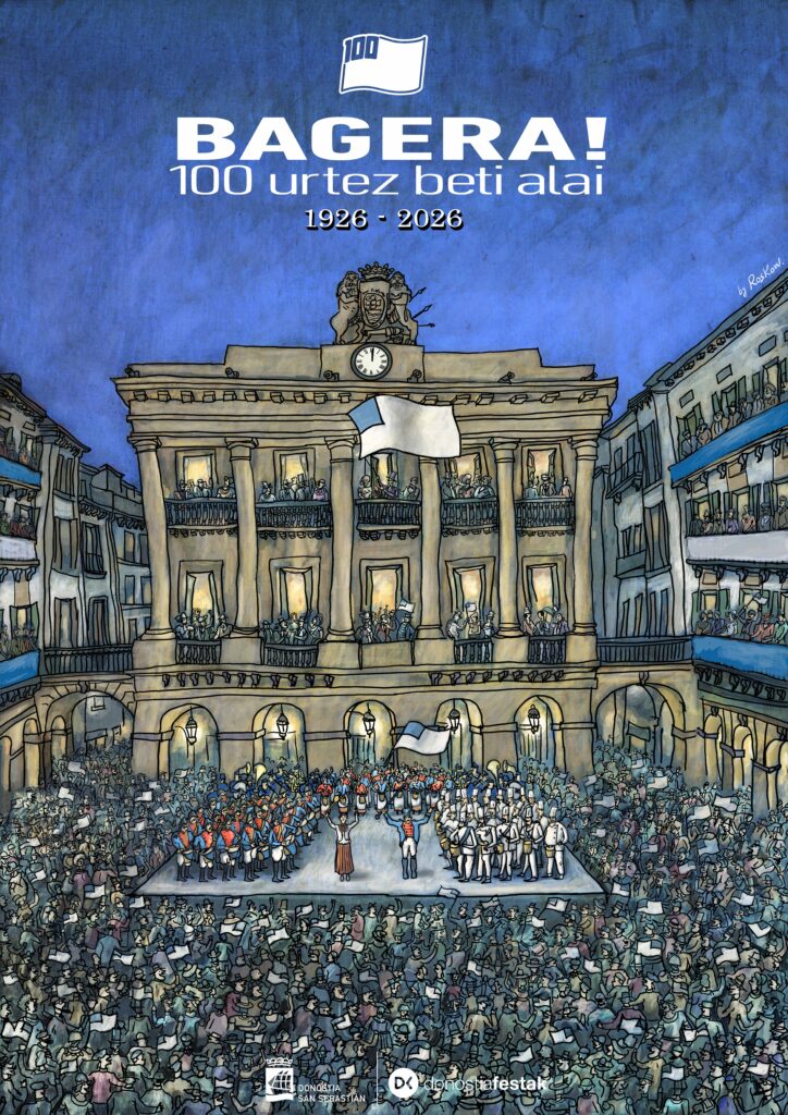 El centenario contará con una identidad propia bajo el lema ‘BAGERA! 100 urtez beti alai’, acompañado de una imagen que combina el número 100 con la bandera de San Sebastián. La fiesta inaugural tendrá también su propio cartel, diseñado por el artista donostiarra Roskow, que pone el acento en la Plaza de la Constitución como epicentro simbólico de la celebración. Además, se repartirán cerca de 28.000 pines conmemorativos entre las personas participantes en la tamborrada, tanto adultas como infantiles, como recuerdo de esta edición histórica.