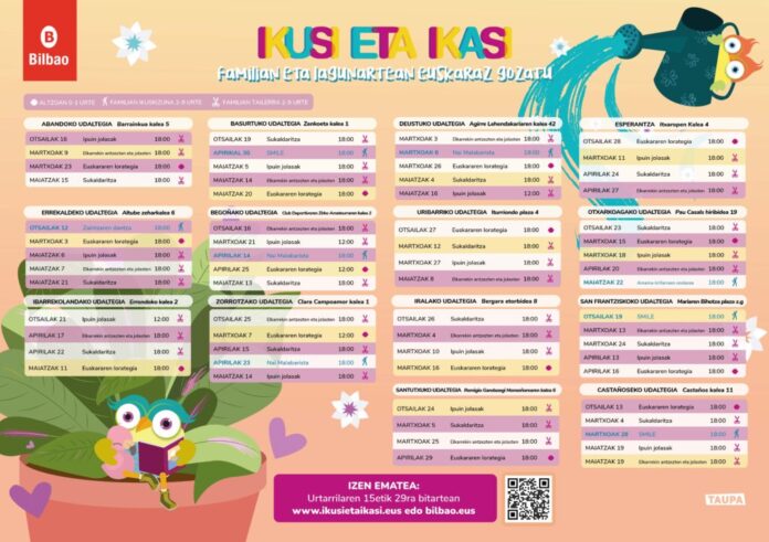 El Ayuntamiento de Bilbao ha abierto el plazo de inscripción de Ikusi eta Ikasi, programa municipal que reparte ocio familiar en euskera por todos los barrios de la Villa. Dirigido a niñas y niños de 0 a 9 años, sus familias tienen de plazo desde hoy y hasta el 29 de enero para formalizar su inscripción en www.ikusietaikasi.eus o Bilbao.eus.