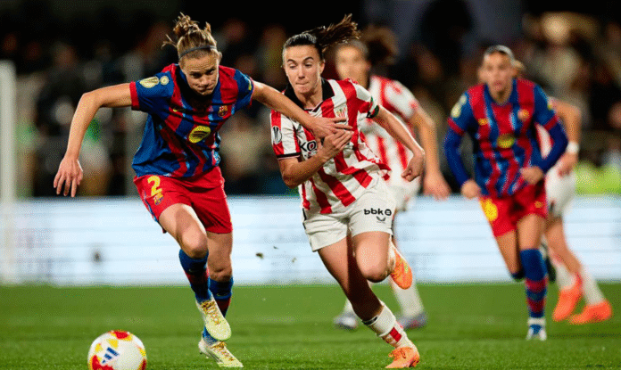 Javi Lergak partida luzea egin nahi izan du talde blaugranarentzat eta hasieran aurkariez ez dute abagunerik izan, Athletic txukun eta uzkur batekin. Hain zuzen ere, Maite Zubietaren zaldi bat izan zen arerioaren areara fedez heldu eta Mapik bota zuena, penaltia ekarri zuena. Nerea Nevadok egin zuen zigor handiena 24. minutuan. Barçak berehala erantzun du, eta 34. minutuan berdindu du, Ona Batllek aldaratze bat sartu eta gero, Alexiaren erremate luzearen ostean. Handik gutxira, korner batean, Irene Paredesek ere baliatu zuen irmotasun falta beste jokaldi nahasi batean. 2-1ekoarekin eta atsedenaldiaren atarian, Kika Nazareth kanporatu egin dute, Naia Landaluzeren sudurra hautsi duen ukondokada baten ondorioz.
