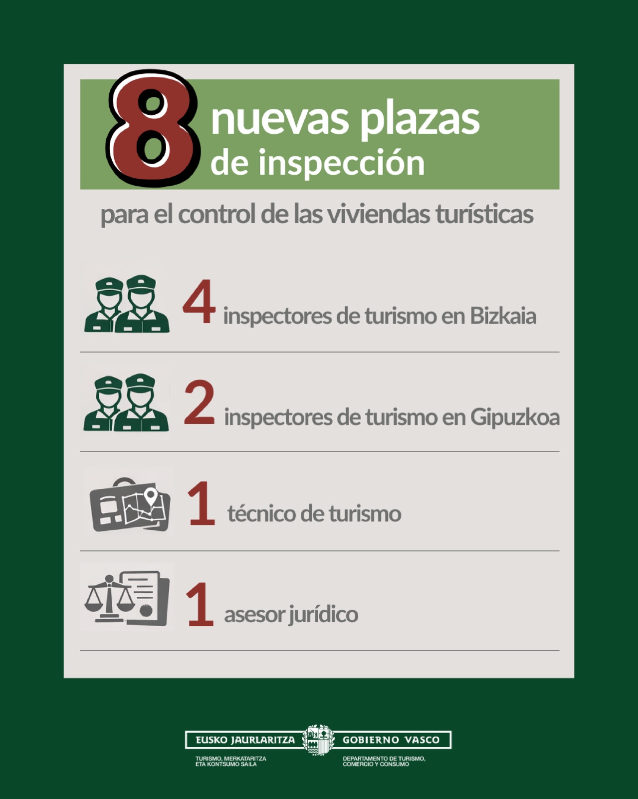 Gobernu Kontseiluak 8 ikuskatzaile-lanpostu berri sortzea onartu du, turismoaren arloko enpresen eta jardueren kontrol- eta ziurtapen-lanak indartzeko eta indarrean dagoen araudia betetzen dela egiaztatzeko.