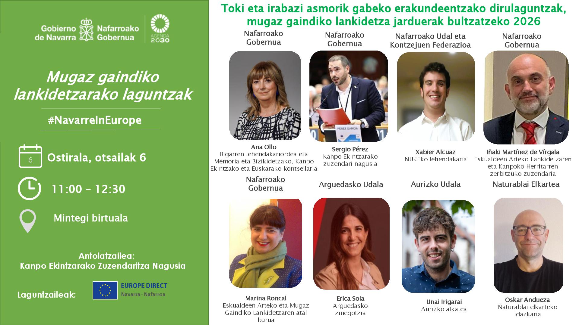 Nafarroako Gobernuko Memoria eta Bizikidetzako, Kanpo Ekintzako eta Euskarako Departamentuak, Kanpo Ekintzako Zuzendaritza Nagusiaren bitartez, mintegi birtual bat antolatu du toki entitateei eta elkarteei zuzendutako mugaz gaindiko lankidetzarako laguntzak ezagutarazteko eta azaltzeko. Mintegia otsailaren 6an, ostirala, izango da, 11:00etan, eta Ana Ollo lehendakariorde eta Memoria eta Bizikidetzako, Kanpo Ekintzako eta Euskarako kontseilariak irekiko du.