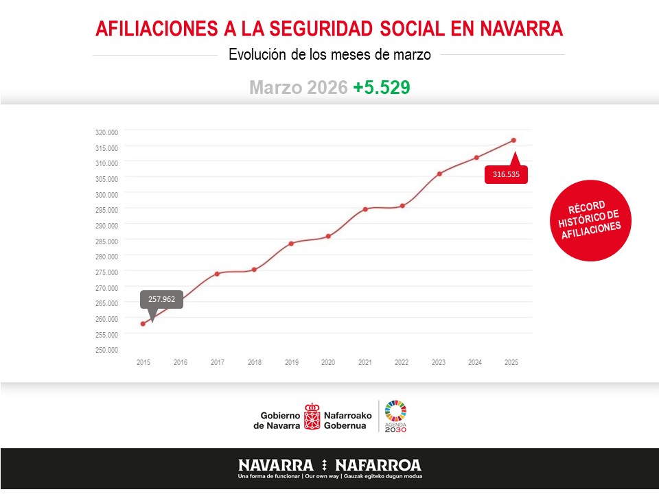 Nafarroak enplegua sortzen jarraitzen d u. Gizarte Segurantzaren otsaileko datuen arabera, urtarriletik hona 1.642 afiliatu gehiago izan dira, %0,52 gehiago. Beraz, enplegua sortzeko bidera itzuli da, eta modu esanguratsuan egin da, gainera. Izan ere, serie historikoan otsailean izandako hirugarren igoerarik handiena da. Urtetik urterako terminoetan, lan-merkatuan 5.529 afiliazio gehiago daude, zehazki, duela urtebete baino %1,78 gehiago. Otsaileko batez besteko afiliazioa 316.535ekoa izan da. Azken finean, enplegu-maila kota historikoetan kokatzen jarraitzen da.