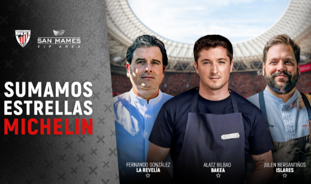 El área VIP de San Mamés elevará aún más su nivel culinario a partir del próximo 12 de abril. Coincidiendo con el encuentro frente al Villarreal CF, se incorporan a la oferta gastronómica del estadio los chefs Alatz Bilbao (restaurante Bakea), Julen Bergantiños (Islares) y Fernando González (La Revelía), todos ellos recientemente galardonados con una Estrella Michelin. Sus creaciones se integrarán en el menú exclusivo que los usuarios pueden disfrutar antes, durante y después de los partidos del Athletic Club.